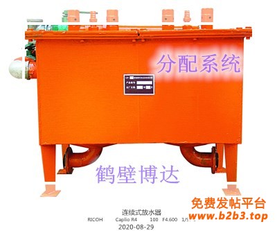 连续式负压自动放水器主要由进水分配系统、积水箱A、积水箱B、通气阀、浮漂组件、进水阀、放水阀、负压平衡阀、负压平衡胶管、积水胶管等部件组成。