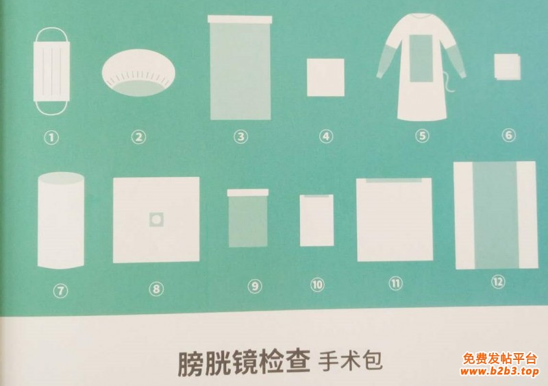 手术包配置:一次性使用医用口罩1个、一次性使用帽1个、器械盘套1条、擦手巾(40*40cm)4块、一次性使用手术衣(加强型)2件、纱布块10片、脚套2双、微型单1条、臀垫单1条、边单(75*90cm)3条、边单(150*150cm)1条、一次性使用包布1条。