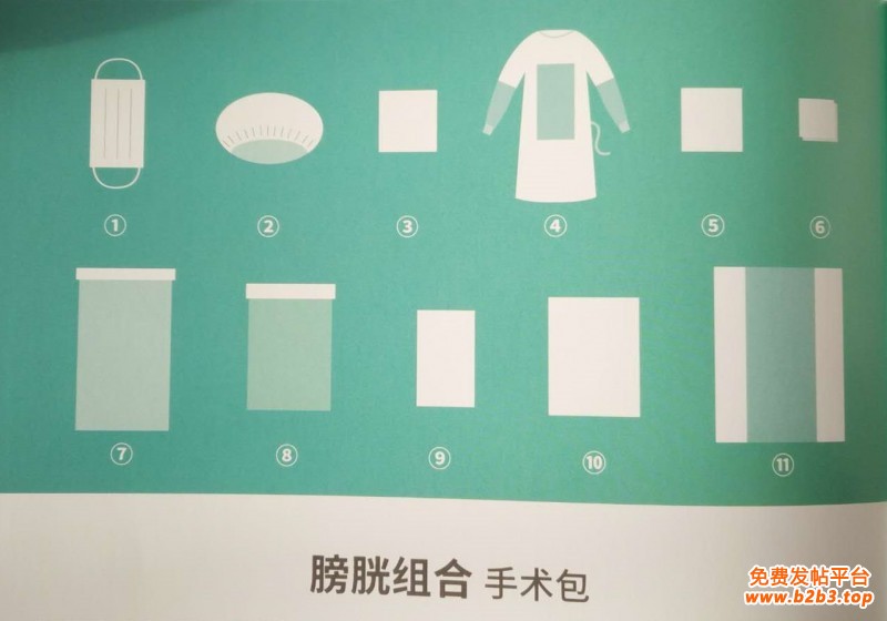 手术包配置:一次性使用医用口罩1个、一次性使用帽1个、擦手巾(40*40cm)2块、一次性使用手术衣(加强型)2件、纱布块10块、器械盘套1条、臀垫单1条、脚套1块、一次性使用医用垫单1条、一次性使用包布1条。