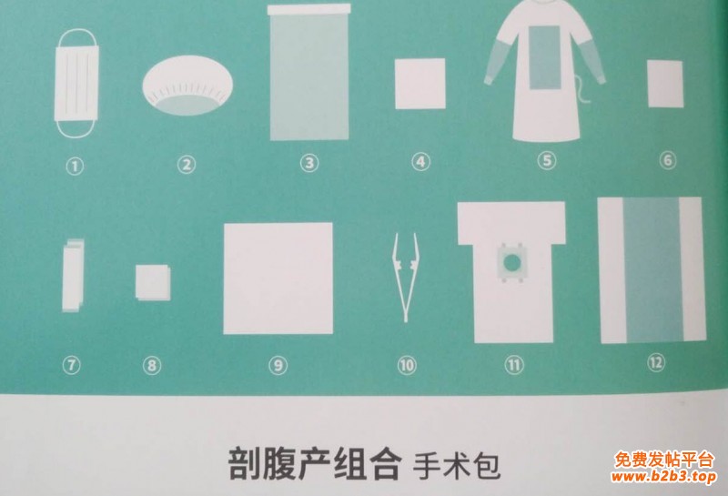 手术包配置:一次性使用医用口罩1个、一次性使用帽1个、器械盘套1条、擦手巾(40*40cm)4块、备胶料(10*50cm)4条、一次性使用手术衣(加强型)2件、手术巾2条、纱布块10片、婴儿包布2块、镊子1把、剖腹产单1条、一次性使用包布1条。