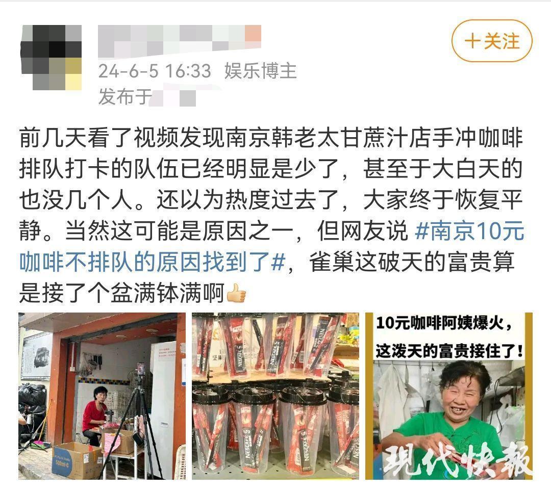 对“咖啡阿姨”韩素珍来说,她到现在都不知道,自己到底为什么会火。三条雀巢、一把剪刀、几个老式热水瓶,就是这样的“手冲”咖啡,把这位74岁的普通南京老太太,“捧”成了流量“网红”,全国各地年轻人蜂拥而至,甚至明星都上门打卡买咖啡。